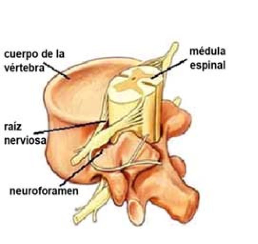 Los huesos (vértebras) de la columna protegen los nervios que salen del cerebro y bajan por la espalda para formar la médula espinal. Las raíces nerviosas son nervios grandes que se desprenden de la médula espinal y salen de la columna entre cada vértebra. (Fig 1)