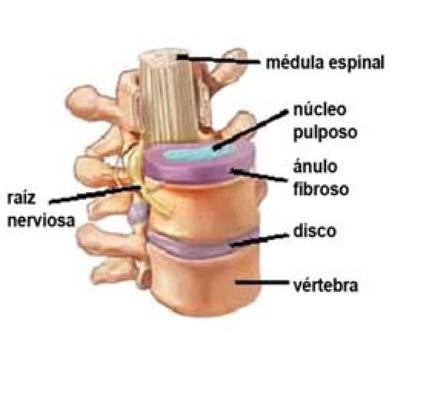 Las vértebras de la columna están separadas por discos que amortiguan y dejan espacio entre las vértebras. Los discos permiten el movimiento entre las vértebras y hacen de "amortiguadores". Tienen una zona central o núcleo pulposo y una periférica o anillo fibroso (Fig 2).