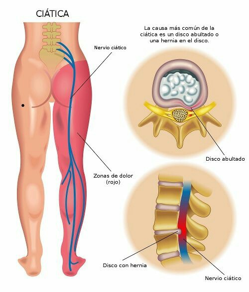 A veces de entrada pero otras en horas o en días, el dolor se irradia a una de las extremidades constituyendo un síndrome ciático y caracterizado por dolor en el trayecto del nervio y / o sensación de hormigueo o acorchamiento. El dolor suele aumentar al toser, estornudar, permanecer quieto de pie o al sentarse.